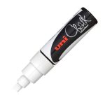Uni Chalk marker pen PWE-8K: chalk-based markers for signwriting on non-porous surfaces, easily removed from such surfaces with a damp cloth. Broad 8mm tip is perfect for large lettering or filling.